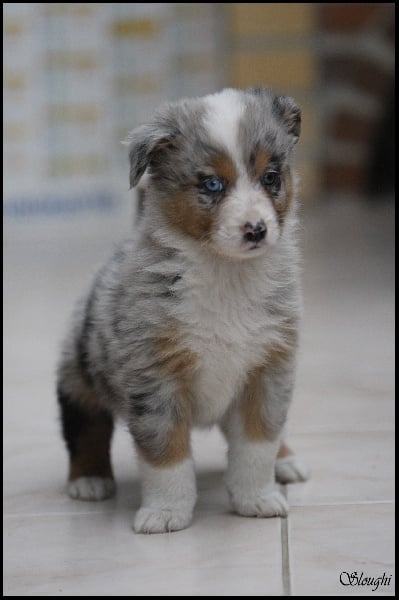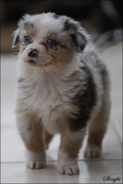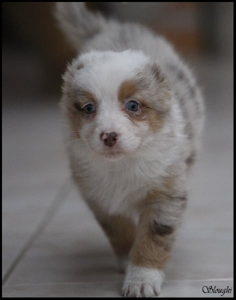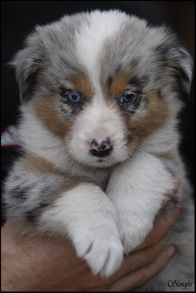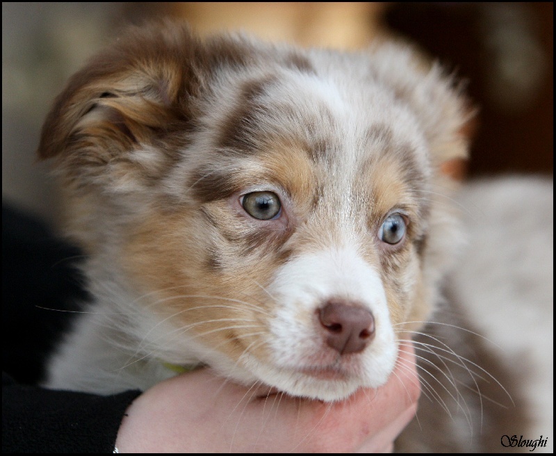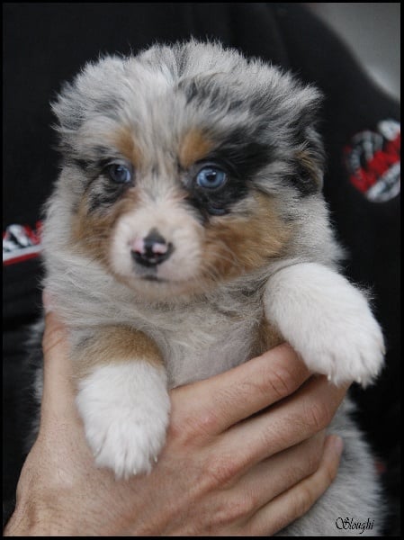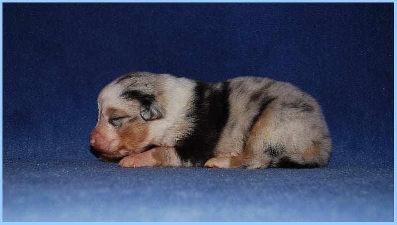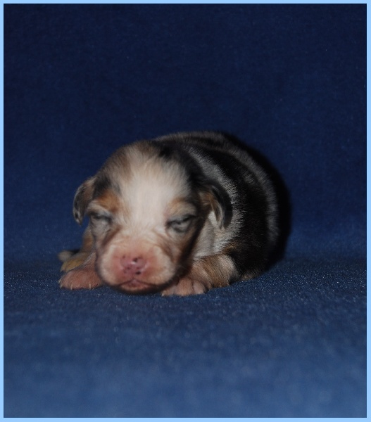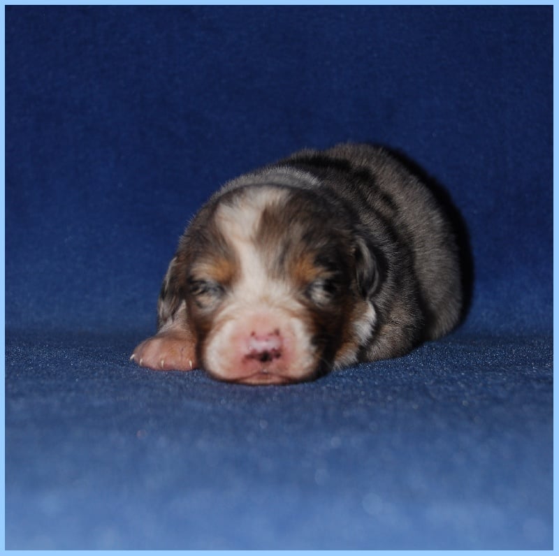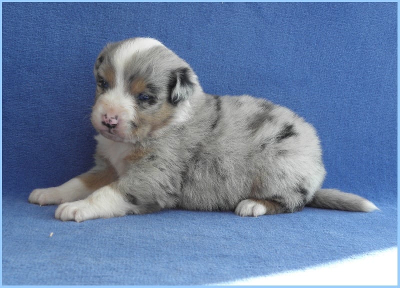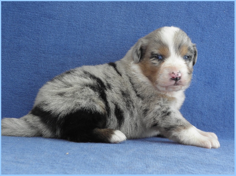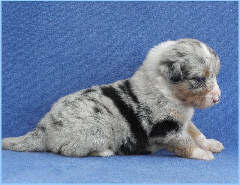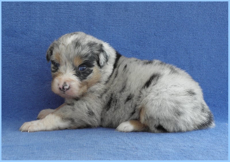 Très joli chiot bleu merle, masqué, tâche noire au niveau de l'oeil gauche.